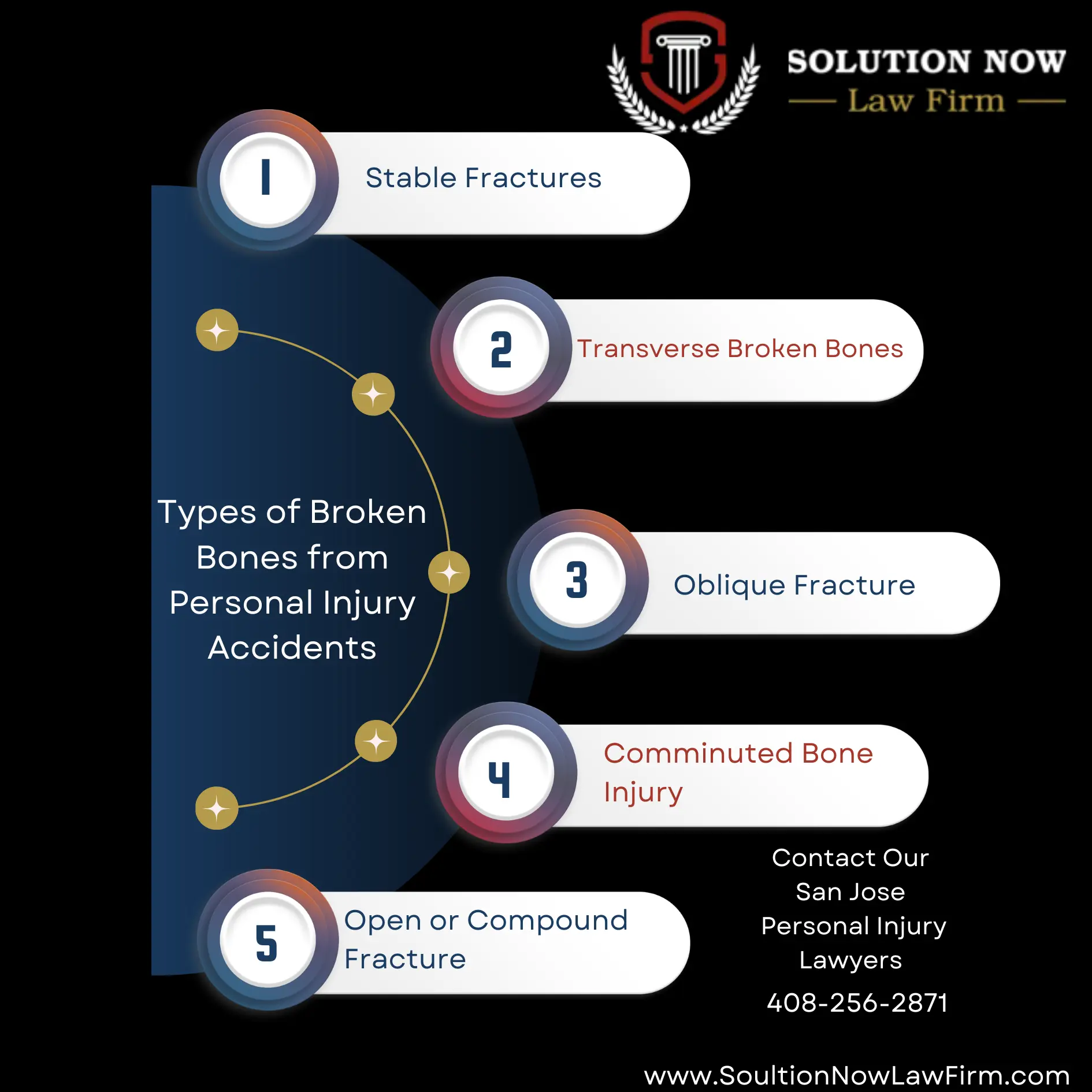 With 206 bones in the body of an adult, there are multiple types of fractures and implications in terms of location, severity, pain, treatment, and prospects for a full recovery. Some common examples of bone breaks that occur in San Jose auto collisions include: